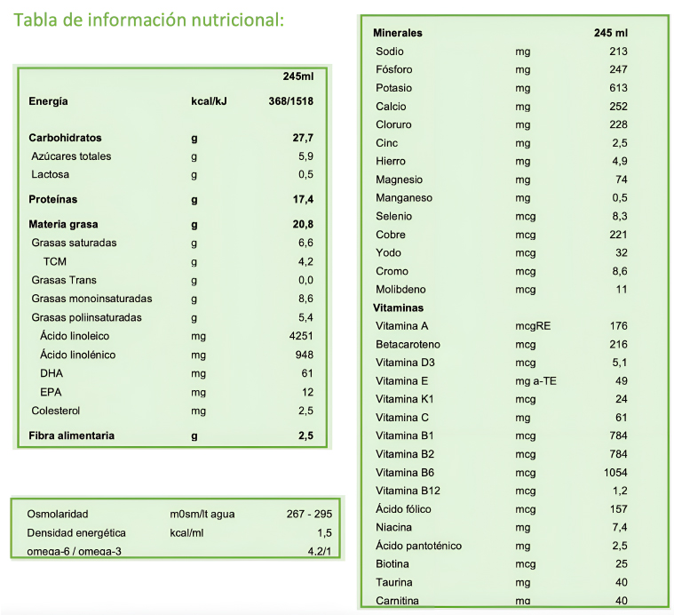 - Densidad calórica de 1,5 kcal/ml (368 kcal/245ml).